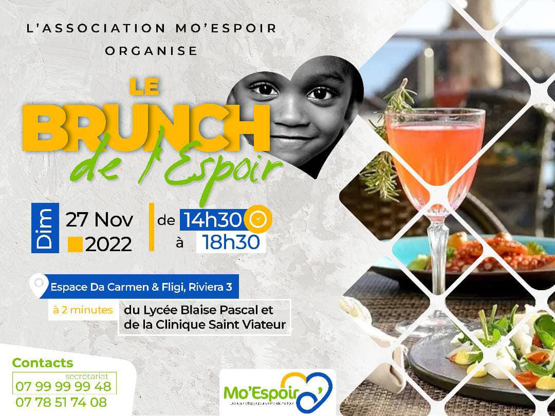 C est avec un grand plaisir que l association Mo Espoir vous convie au Brunch de l Espoir ; Ceremonie de lancement officiel de ses activites, qui se tiendra le Dimanche 27 Novembre 2022 a l'espace Da Carmen & Fligi Riviera 3
